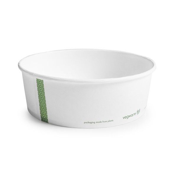 Wide paper food bowl. Vegware's Bon Appetit bowls are a unique mix & match range for the ultimate in style and versatility. A panoramic view of your foodie fuel. Premium wide presentation for steaming curries, colourful burrito bowls, or hearty salads. Sustainably-sourced board with a plant-based PLA lining. Stylish white with Vegware messaging in green. Award-winning quality by Vegware, made from plants. Designed for industrial composting, made from recyclable materials.