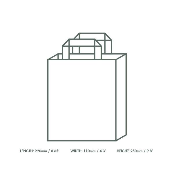 Sturdy recycled paper carrier bag with internal tape handles. Ideal for food to go. 100% recycled unbleached paper. Brown kraft colour. Award-winning quality by Vegware, made from plants. Designed for industrial composting, made from recyclable materials.