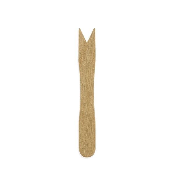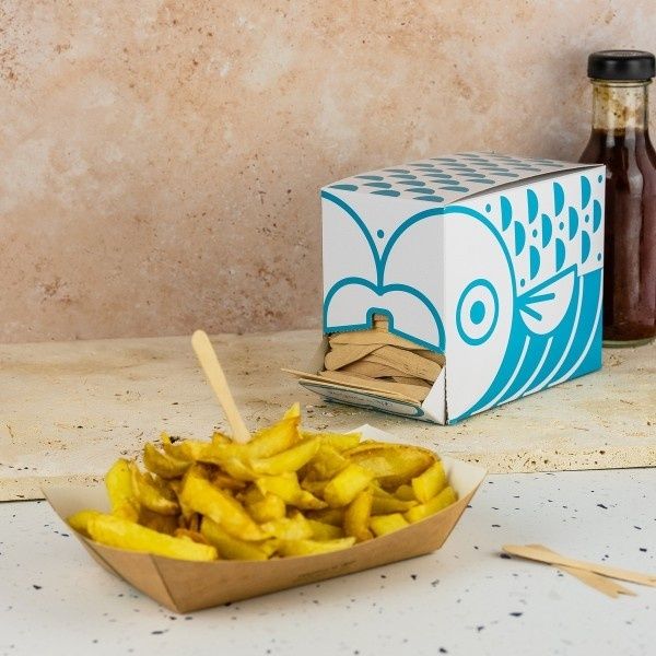 3.3in wooden chip fork, made from FSC-certified birchwood. Comes in fun fork dispenser. Perfect for enjoying your chips, whilst keeping your hands sauce-free. Made from FSC-certified birchwood. Classic double pronged chip fork in a white and blue fish-style cardboard dispenser. Award-winning quality by Vegware, made from plants. Designed for industrial composting.