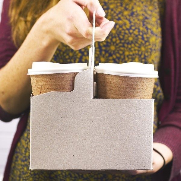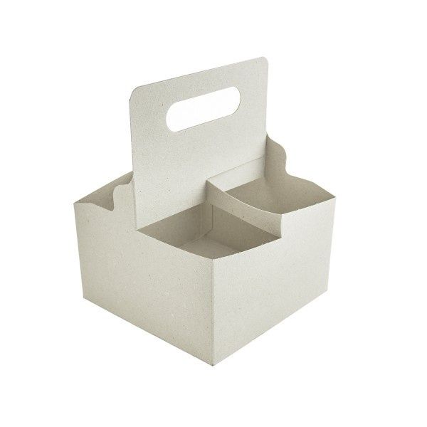 A handy tray for carrying four cups. Ideal for people with more friends than hands. Made from recycled pulp. Pale unbleached grey. Award-winning quality by Vegware, made from plants. Designed for industrial composting, made from recyclable materials.