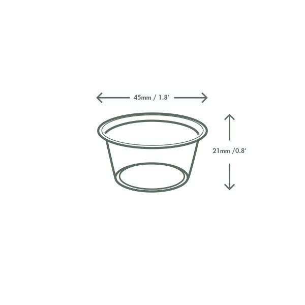 Vegware's smallest portion pot. For cold dressings, sauces, juice shots, or sampling. Made from PLA, a renewable material made from plants. Clear for visibility. Award-winning quality by Vegware, made from plants. Commercially compostable where accepted.