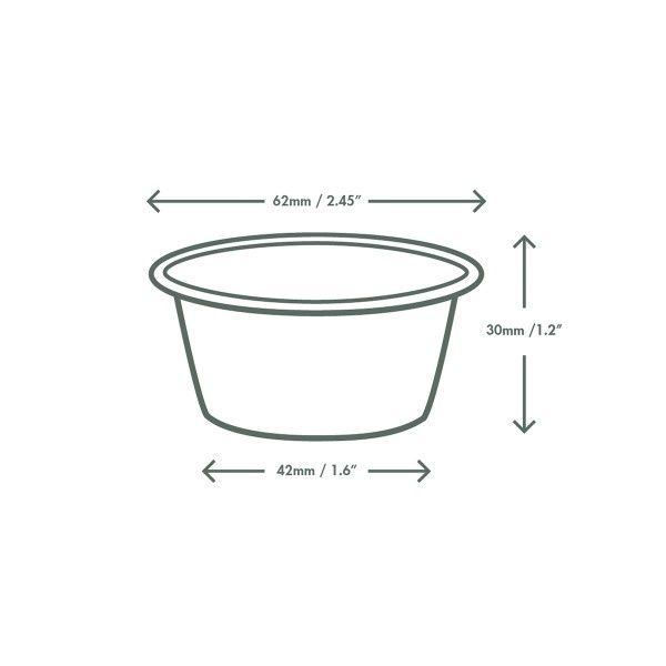A cute fibre-based portion pot! The perfect vessel for all your condiments – hot sauces or cold dips. Our moulded fibre uses reclaimed natural materials such as sugarcane, bamboo or wood pulp. Lipped edge allows for improved lid security. Elegant design in crisp white colour with textured exterior. Award-winning quality by Vegware, made from plants. Made from recyclable materials.