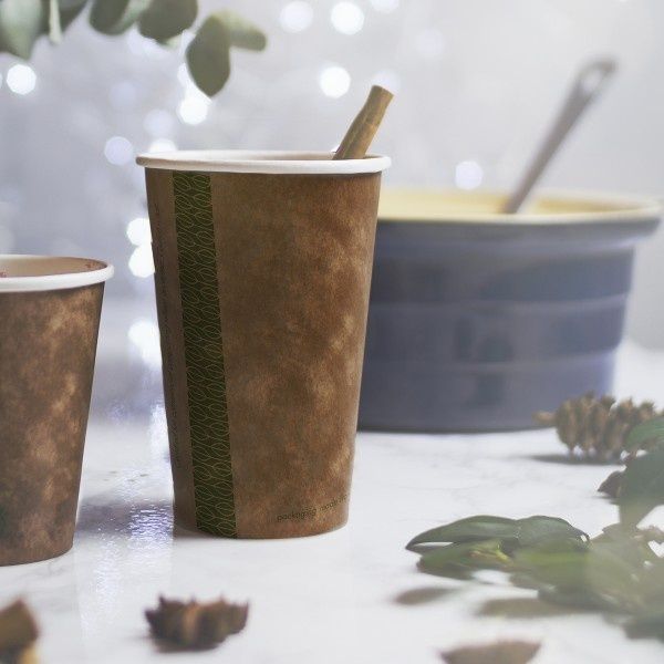 Single wall hot cup. Fits Vegware's 89-Series lids. For coffee, tea and all hot drinks, or soup to go. Also ideal portion control for chips or fried treats. Sustainably-sourced board with a plant-based PLA lining. Brown kraft, with Vegware messaging in green. Award-winning quality by Vegware, made from plants. Designed for industrial composting; recyclable in coffee cup recycling schemes – check your local options.