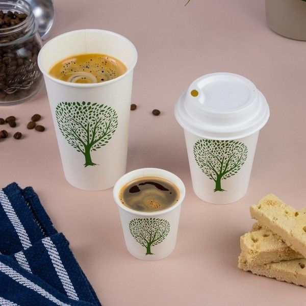 Made from sustainably-sourced board with a water based lining, it features a crisp white finish with green tree branding. Designed for both home and industrial composting, with recyclability supported in coffee cup recycling schemes where available.