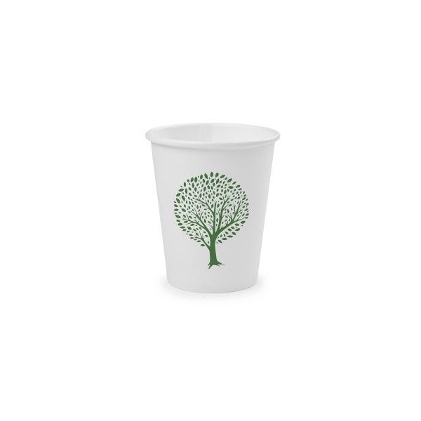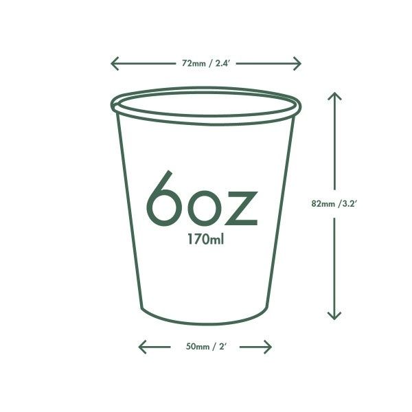 A home compostable 6oz single wall hot cup in our revamped Green Tree design! Fits Vegware's 79-Series lids. For espresso or small speciality coffee, hot dipping sauces and any hot sampling. Sustainably-sourced board, lined with a water based lining. Crisp white board with tree in Vegware green. Award-winning quality, made from plants. Designed for home or industrial composting, recyclable in coffee cup recycling schemes – check your local options.