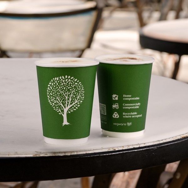 Our iconic double wall cups now available in our revamped, home compostable Green Tree range. Fits Vegware's 79-Series lids. For coffee, tea and all hot drinks, or soup to go. A double wall of sustainably-sourced board, lined with a water based lining. Verdant green with crisp white tree. Award-winning quality, made from plants. Designed for home or industrial composting, recyclable in coffee cup recycling schemes – check your local options.