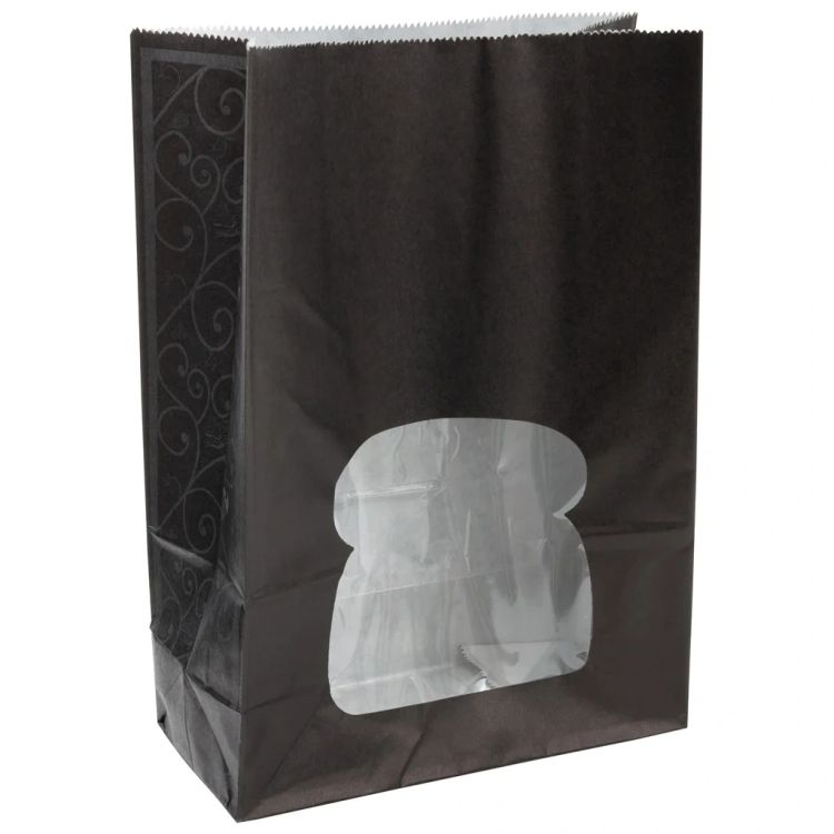 The sandwich bag can contain two square cut sandwiches or baked products such as cookies, traybakes or snacks. The two sandwich halves and their filling can be easily seen through the clear window on the front face and are tastefully and attractively presented in the black laminated sandwich bag. The silver grey design pattern on the sides of the bag also makes the packaging special and stylish.
