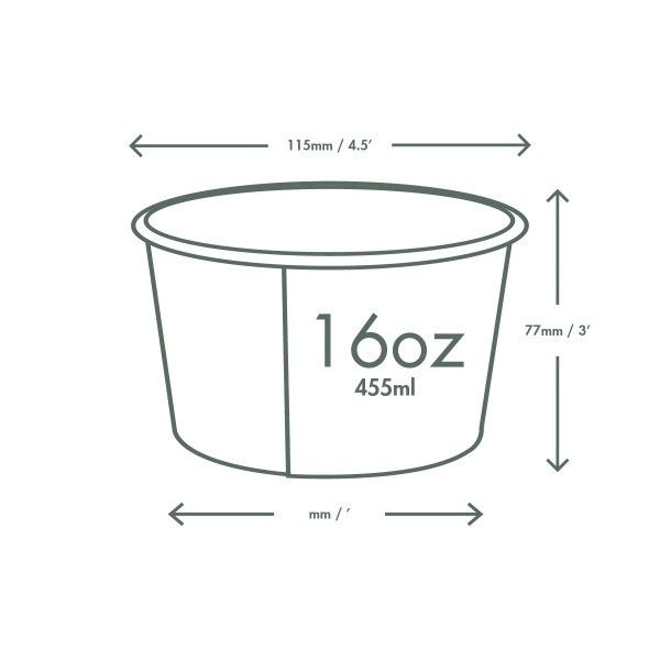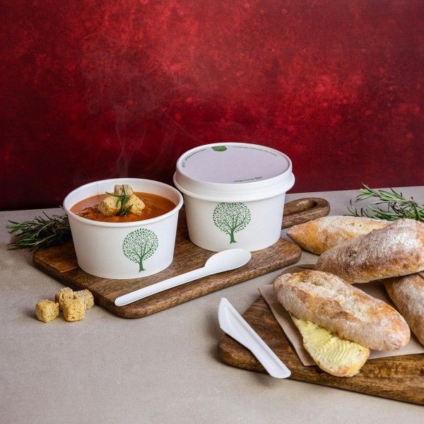 Versatile, leak-proof, sturdy round tub. Fits Vegware's 115-Series lids. For hot soups, pasta, noodles, porridge or one-pot meals, or for cold salads or ice cream. Sustainably-sourced board with a plant-based PLA lining. Part of the Green Tree collection. Award-winning quality by Vegware, made from plants. Designed for industrial composting, made from recyclable materials.