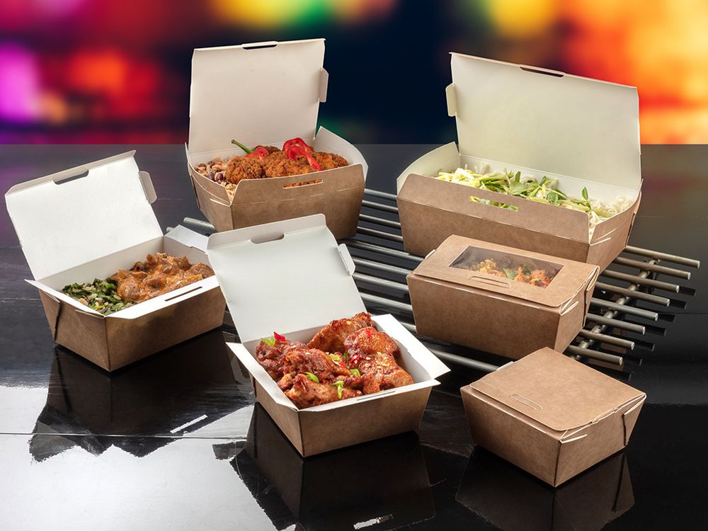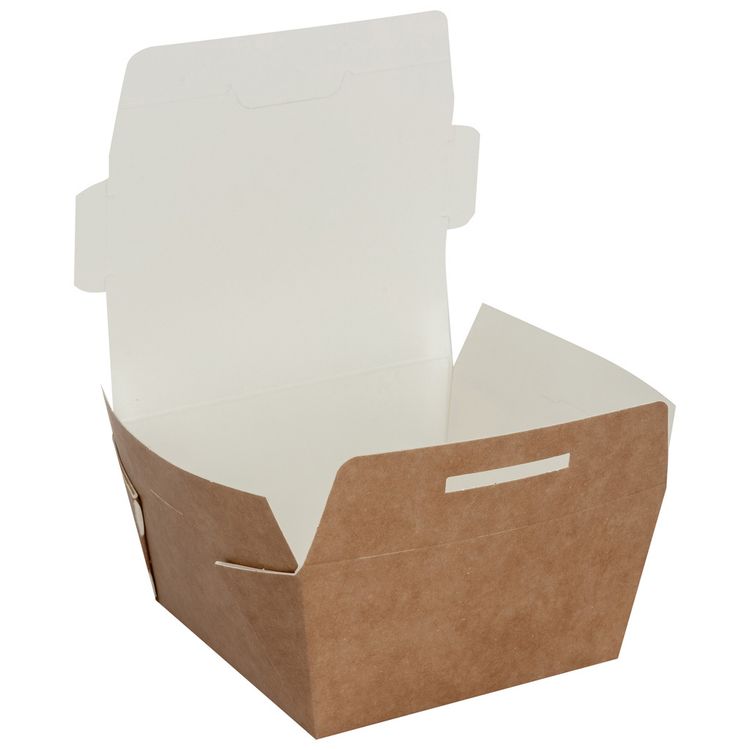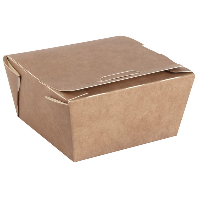 Created from paperboard, these boxes feature an integrated tuck top lid to help prevent spills and leaks and can even be used to reheat food at home.