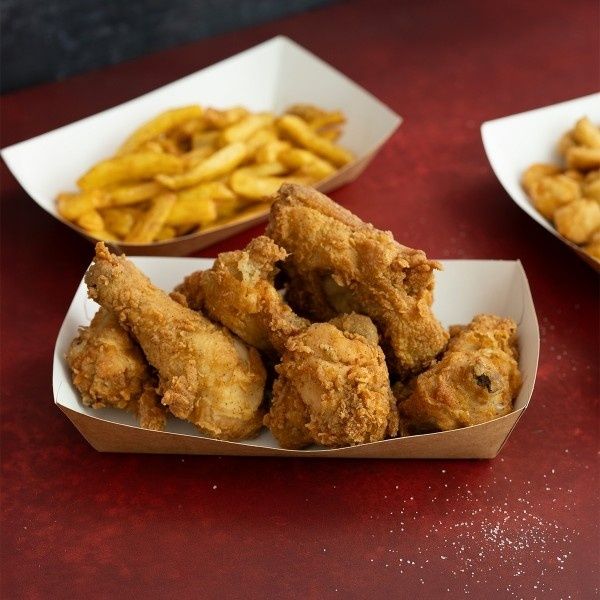 Serve hot or sweet treats with the 9 x 6in Kraft Food Tray, perfect for mac & cheese, loaded fries, doughnuts, churros, and cookies. Its sturdy, grease-resistant paperboard keeps food contained and appealing.